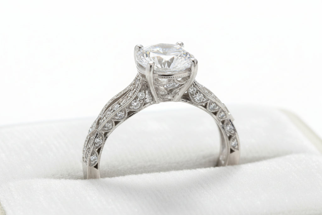 This is a sophisticated 18K White Gold engagement ring featuring a high-polish finish and intricate diamond accents. The setting is designed with a vintage-inspired, bypass-style shank that adds a sense of movement and unique texture. Currently set with a Cubic Zirconia center, ready to be replaced with a diamond or gemstone of your choice. The band features .36tw of natural white diamonds.