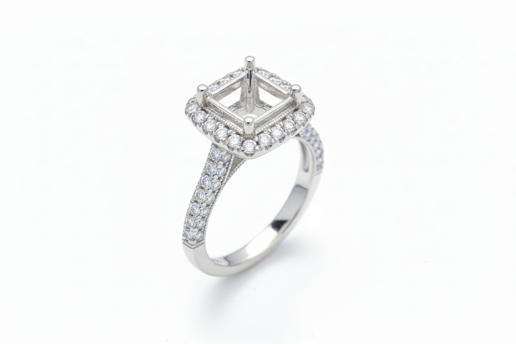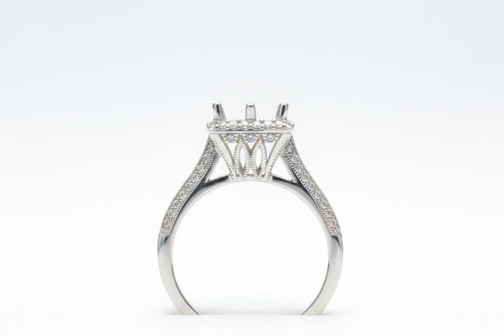 This is a premium 18K White Gold engagement semi-mount featuring .12 carats total weight of natural diamond accents. The setting is designed with a vintage-inspired aesthetic, showcasing intricate craftsmanship and a sparkling halo.