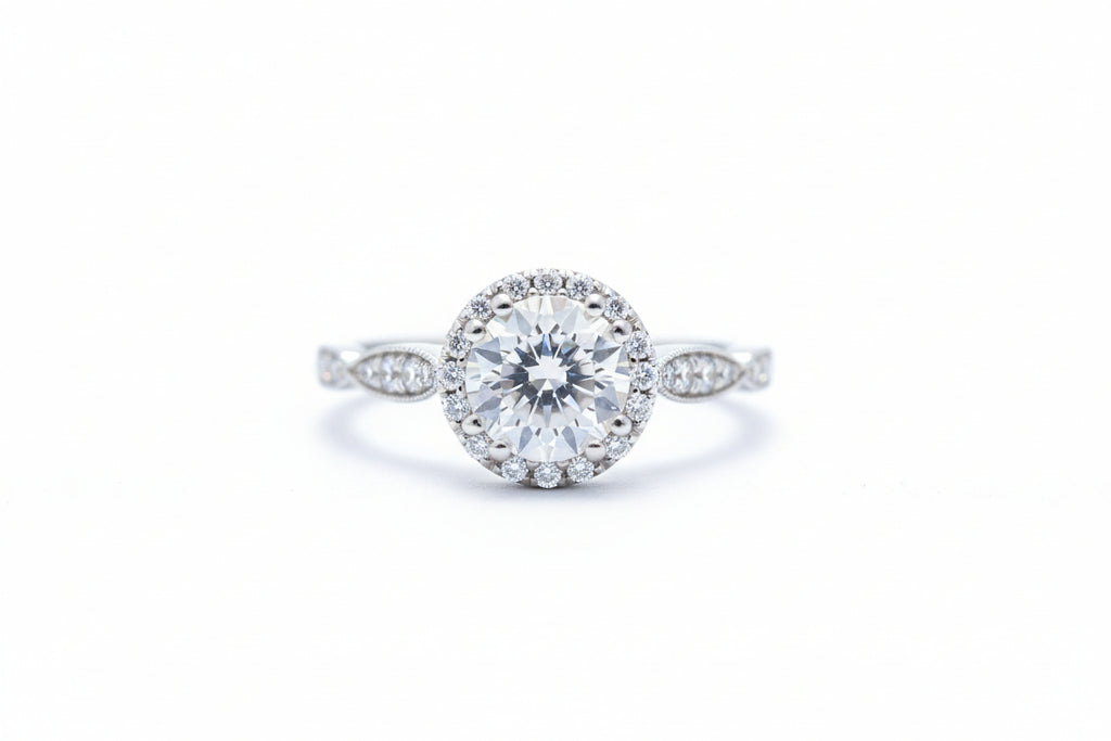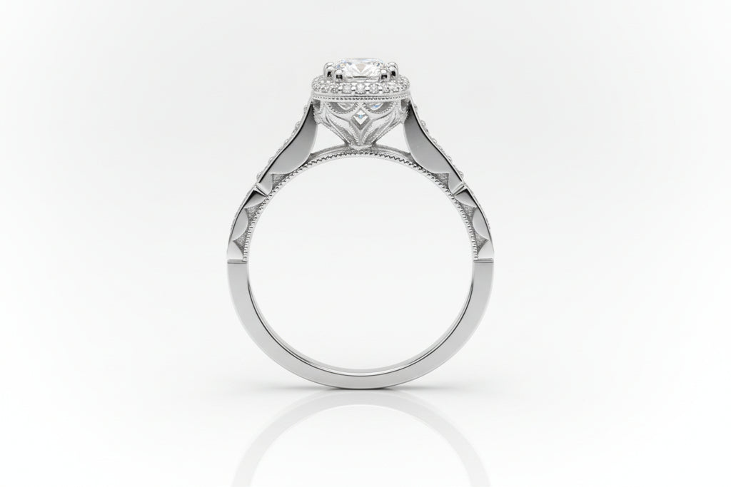 Elevate your proposal or give a new life to an heirloom stone with this exquisitely crafted 18K White Gold engagement mounting. Unlike standard 14K gold, this 18K setting offers a richer luster and a more substantial weight.