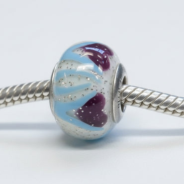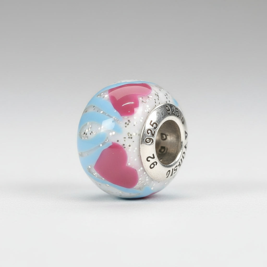 Elevate your charm jewelry with this exquisite handcrafted lampwork bead. Featuring a high-polished 925 Sterling Silver core, this bead is designed for durability, beauty, and timeless style. The intricate glasswork showcases a dreamy landscape of floating hearts and ethereal swirls.