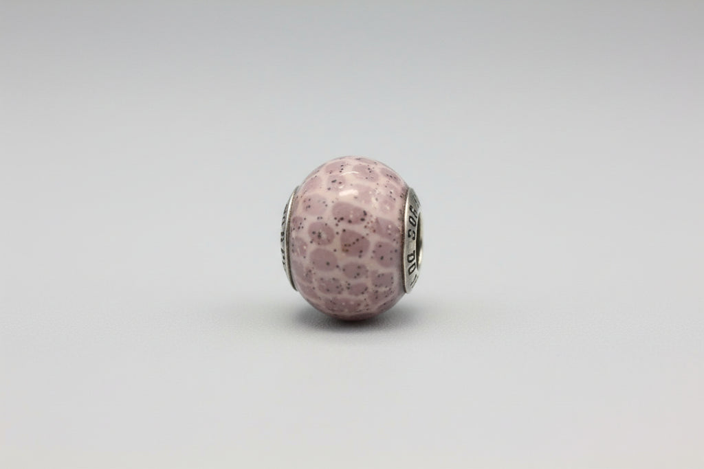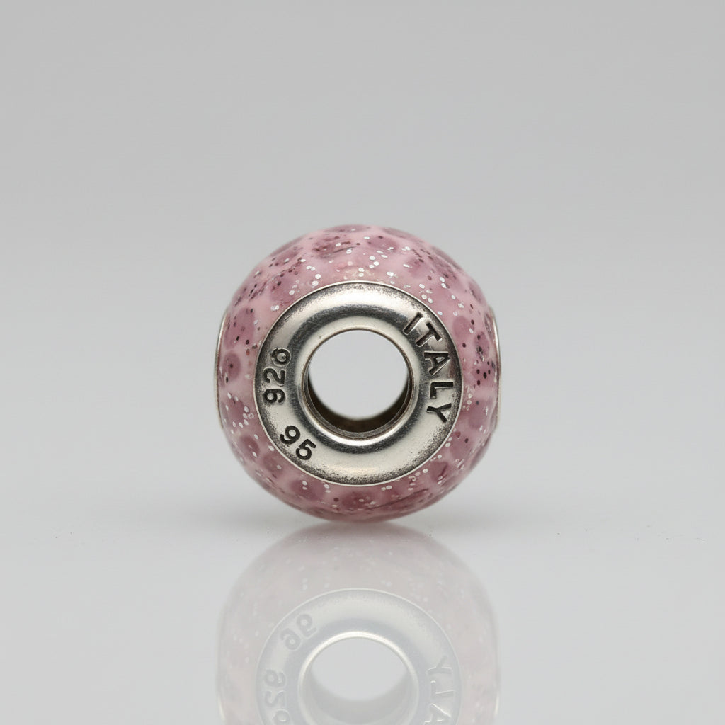 Add a touch of feminine sparkle to your collection with this stunning Murano Glass Charm. This bead features a soft pink core infused with delicate glitter "speckles" that catch the light beautifully from every angle.