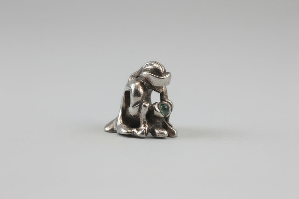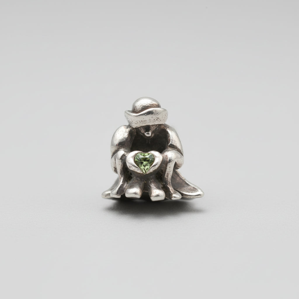 A masterpiece for the serious collector, this Retired Trollbeads "Wisdom" Bead is a stunning example of the brand’s artistic heritage. This sculptural sterling silver piece depicts a figure in deep contemplation holding a genuine, faceted Green Tourmaline gemstone (often referred to as the "Wise Old Man" bead).