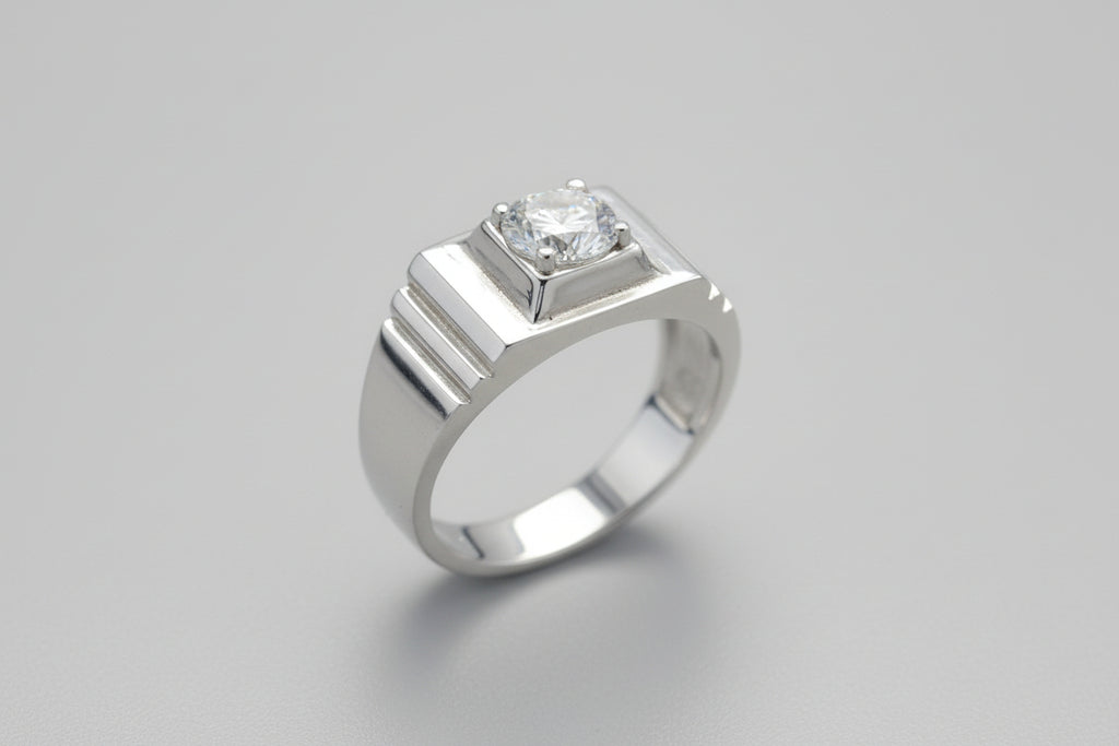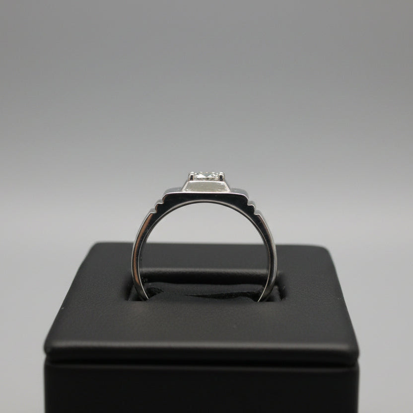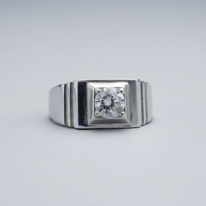 Define your style with a piece that balances geometric precision with classic luxury. This Sterling Silver signet ring features a prominent, brilliant-cut center stone set within a raised square platform. The shoulders of the ring are meticulously crafted with deep, parallel architectural grooves, leading into a high-polish tapered band.
