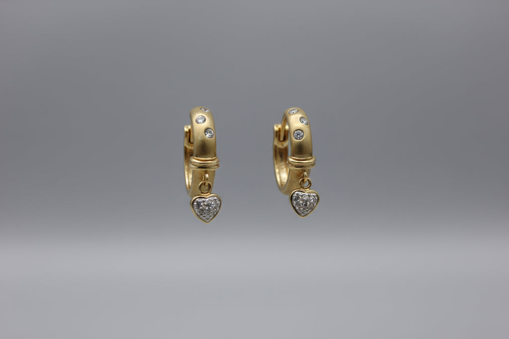 Dangling gracefully from each hoop is a delicate heart charm, fully pavé-set with brilliant diamonds that catch the light with every movement. The contrast between the bold, substantial hoop and the dainty, shimmering heart creates a sophisticated silhouette perfect for both day and night. With a total weight of 0.96 CTW, these earrings offer significant sparkle and high-end craftsmanship.