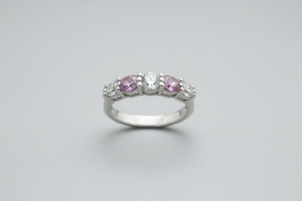At its heart, three round-cut sparkling diamonds ($0.59$ CTW) provide a radiant foundation of light. Interspersed between them are two vibrant, high-quality pink sapphires ($0.46$ CTW), creating a sophisticated contrast that draws the eye. The shared-prong setting ensures maximum light exposure for every stone, resulting in a breathtaking shimmer from every angle.