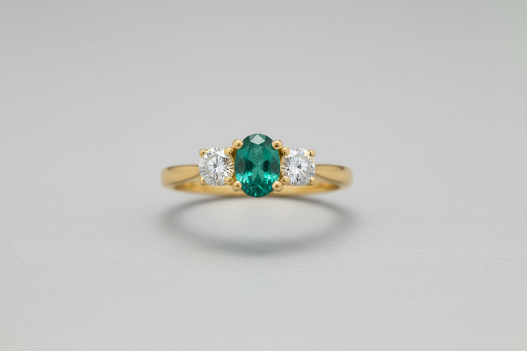 The center features a vibrant .40-carat (approximate) natural oval emerald, radiating deep, lush green. It is perfectly flanked by two brilliant oval diamonds, totaling approximately .40ctw. The diamonds are near-colorless (G-H) and clear (SI), providing a dramatic, fire-filled contrast that makes the emerald truly pop.