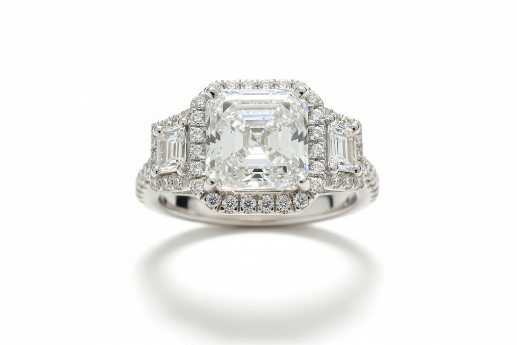 One 18K white gold custom made by Noble House Jewelry engagement ring featuring a 2.70 Asscher cut diamond that is I color VS2 in clarity certified by EGI CA. The ring features two trapezoid side diamonds weighing .33ctw and .49cts of prong set round brilliant cut diamonds. This ring is an absolute showstopper!