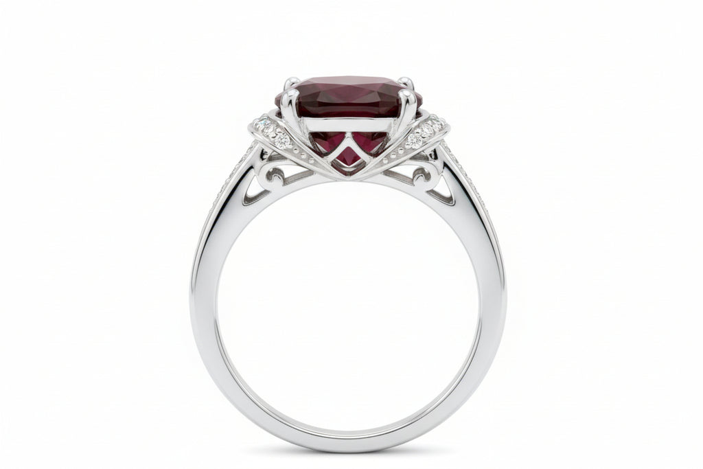 This ring blends vintage-inspired romanticism with a sleek, modern finish, making it an ideal choice for January birthdays or anyone who loves the dramatic allure of deep red gemstones.