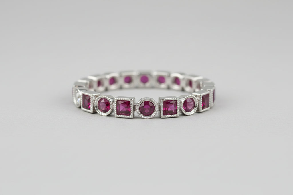 Experience the masterfully curated contrast of this 1.10 CTW natural ruby band. Set in luminous 18K White Gold, this piece features a rhythmic alternation of vivid square-cut (0.55 CTW) and round-cut (0.55 CTW) rubies. Each gemstone is individually encased in a precision-crafted bezel setting with delicate milgrain detailing, offering a vintage-inspired aesthetic with modern structural security. The 18K gold composition ensures a high-purity, mirror-like finish that perfectly offsets the deep, saturated crimson of the rubies.