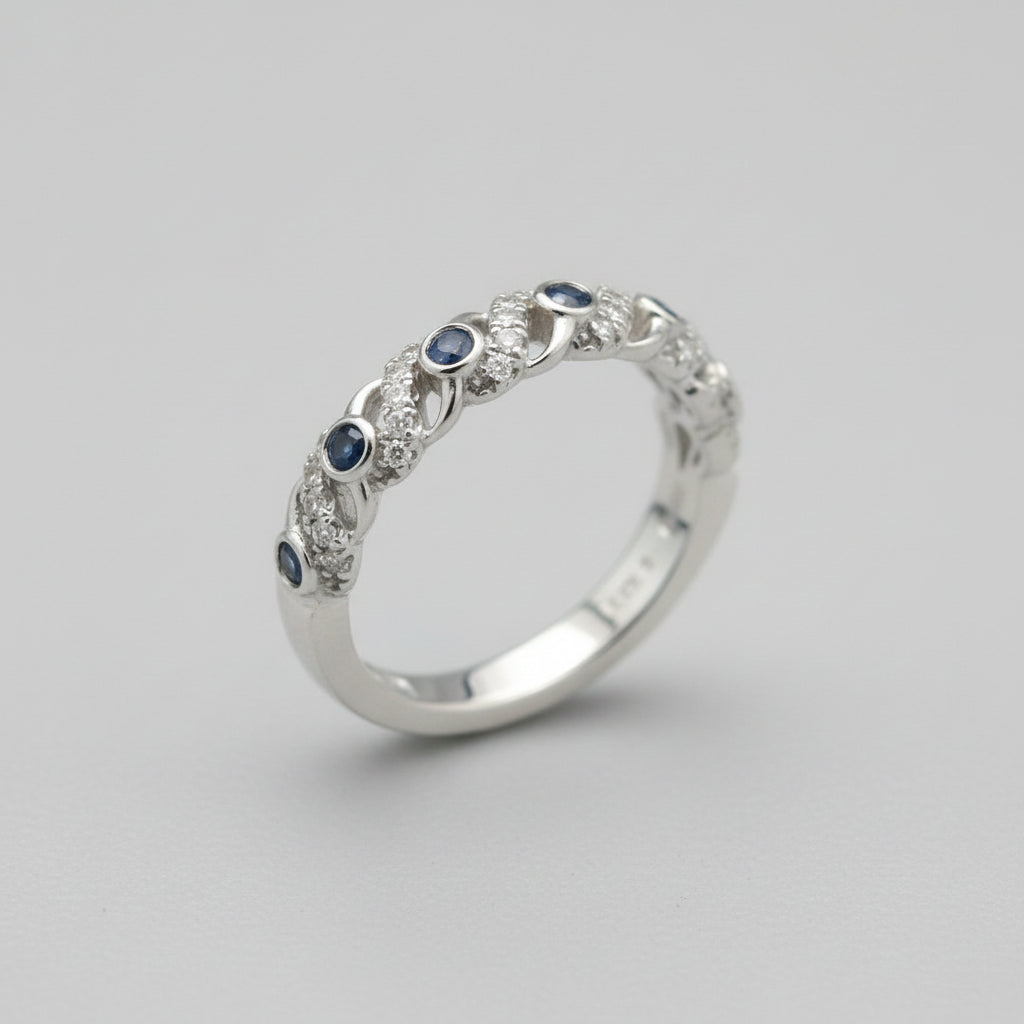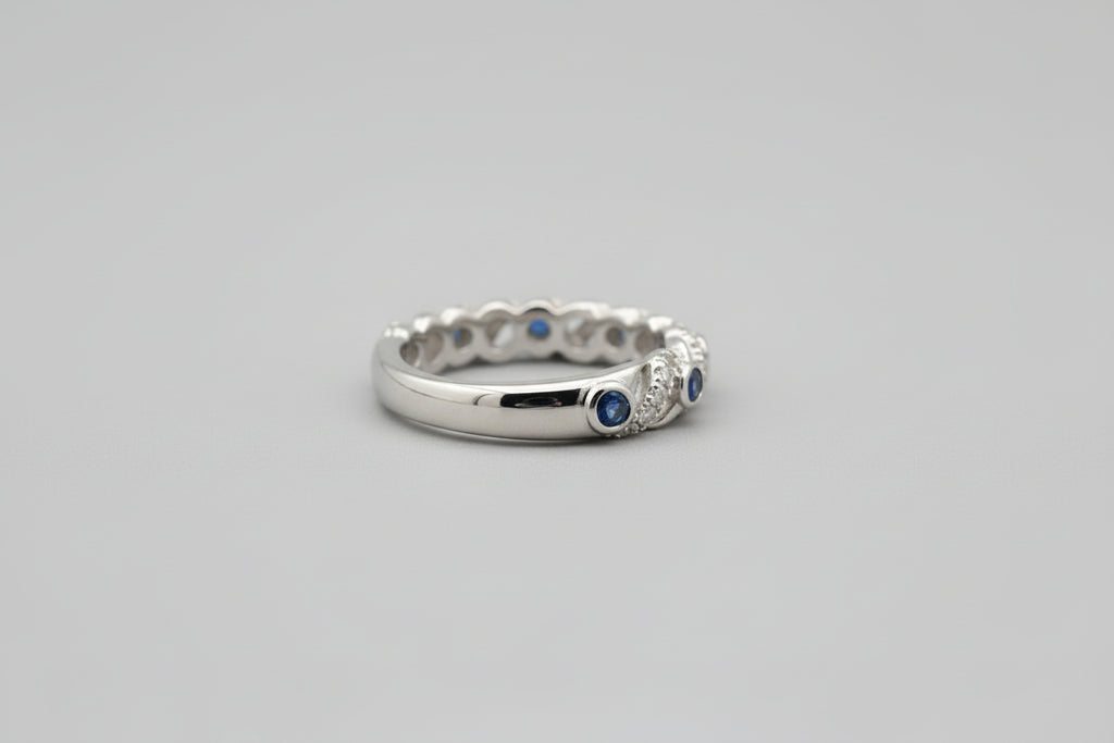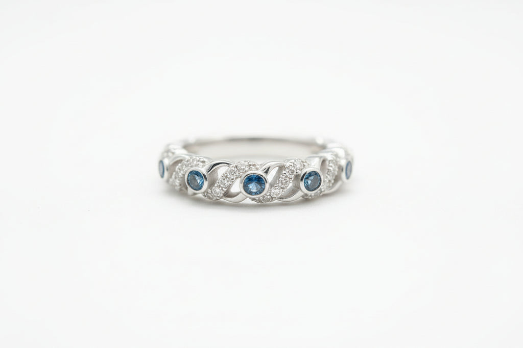 The ring features a sophisticated three-row design: a central row of vibrant blue diamonds is elegantly flanked by two outer rows of shimmering white diamonds. With a total weight of .25 carats, this band offers a perfect balance of color and classic sparkle. Its low-profile, comfortable fit makes it ideal for stacking with an engagement ring, adding to a wedding set, or wearing alone as a distinctive right-hand ring.