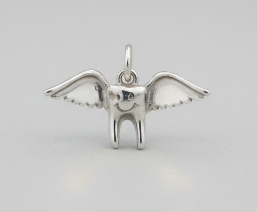 This charm features a highly detailed, three-dimensional molar with feathered angel wings. Crafted with a bright, polished finish, it captures the magic of childhood tradition in a sophisticated way. It includes a sturdy jump ring, making it ready to slide onto a necklace chain or attach to a classic charm bracelet.